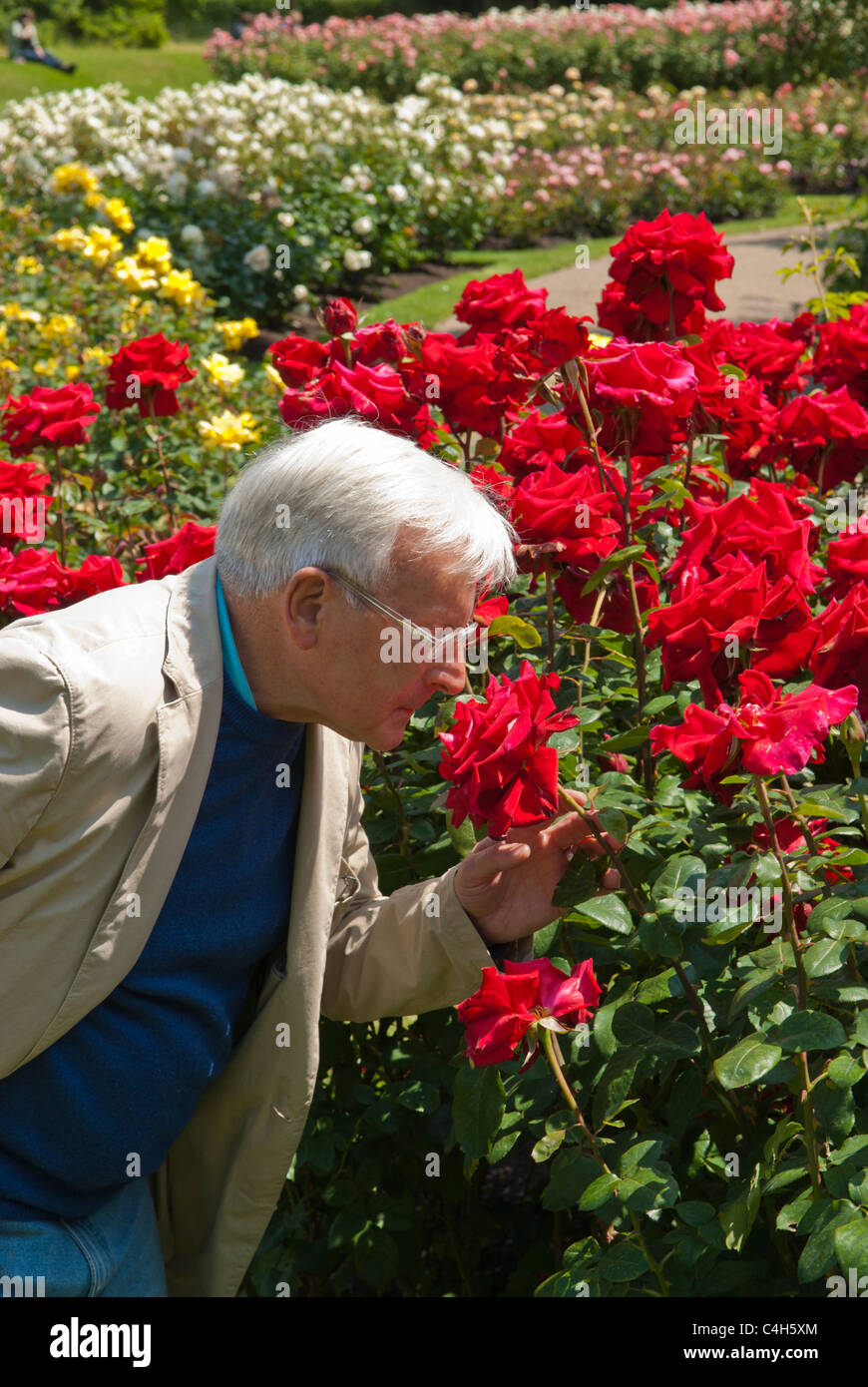 An Old Man Smells Red Rose In Rose Gardens At Queen Mary