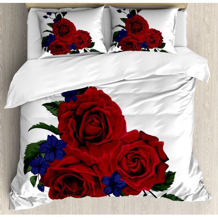 Rose Queen Size Duvet Cover Set Blooming Red Roses With Gentle Wild Flowers Leaves Bouquet Corsage Decorative 3 Piece Bedding Set With 2 Pillow