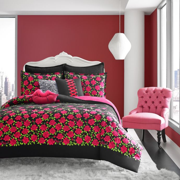 Betsey Johnson Rose Garden Comforter Set In Black Bed